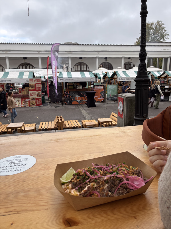 Finn and I really liked Ljubljana’s atmosphere. It was busy and a bit cold, sure, but it still felt laid-back and inviting. The river was lined with cafés and restaurants with fairy lights and heaters. The cobbled streets of the old town were clean and car-free. And the architecture? Well, that was my favourite part.